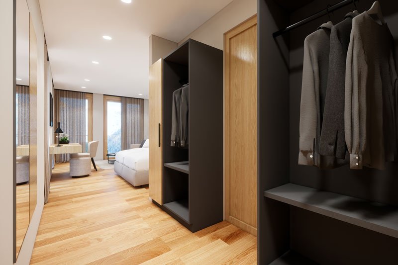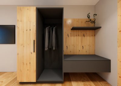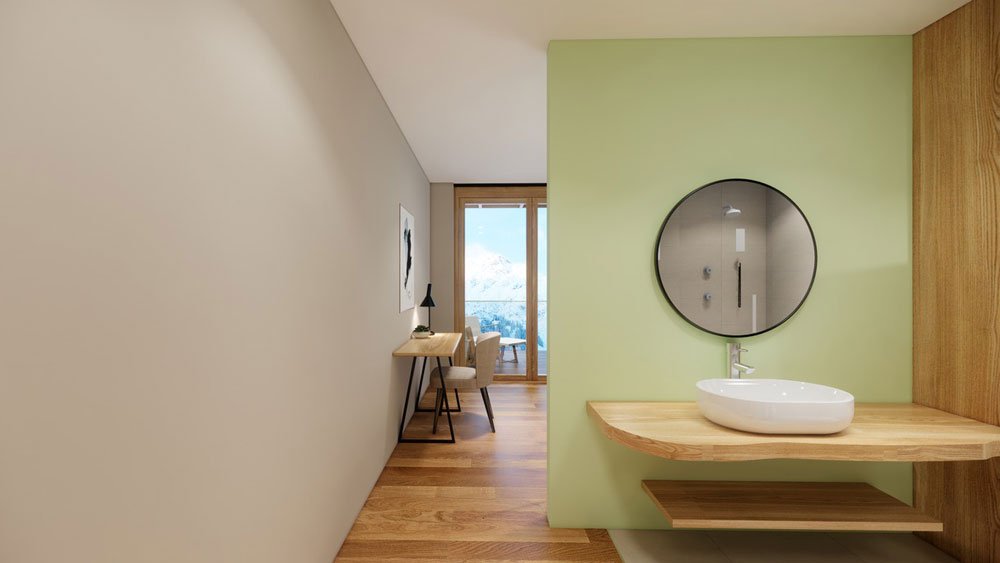 These natural, approx. 26 m² rooms are completely furnished with high-quality and allergy-friendly Swiss pine wood. The soothing and calming pine scent is ideal to really relax during your vacation. The rooms have the following equipment: