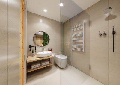 - bathroom with panoramic shower, toilet, hairdryer, care products, cosmetic mirror and cozy bathrobes
