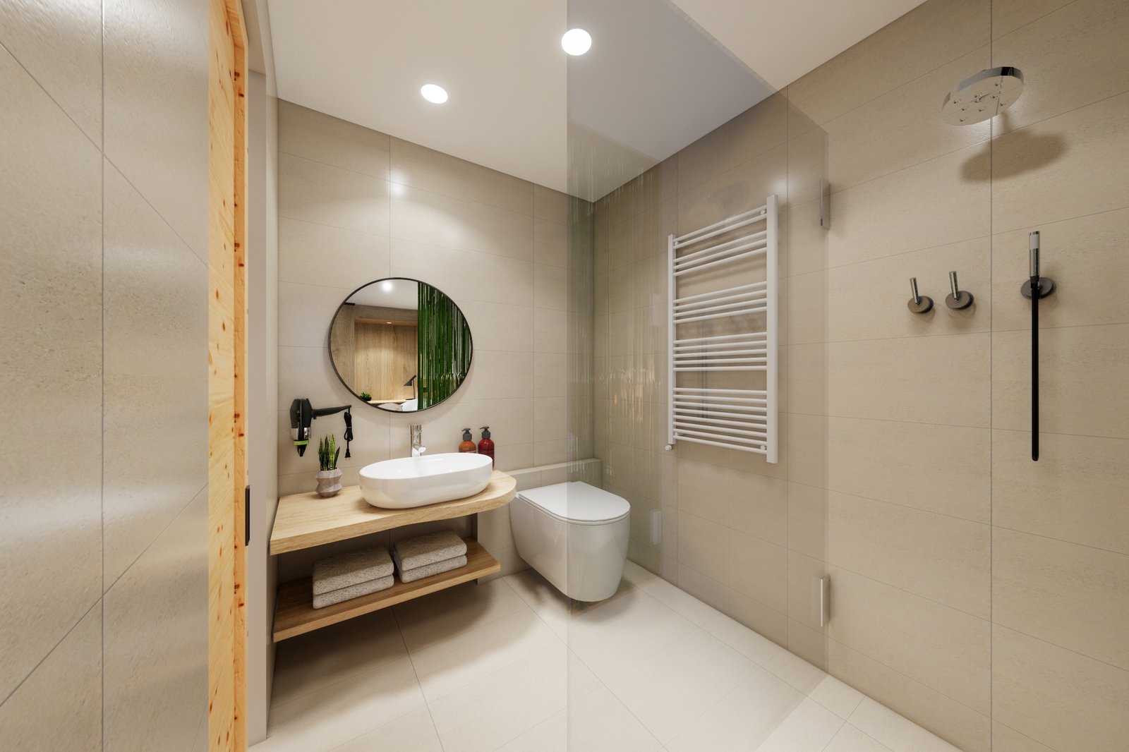 - bathroom with large rain shower, hairdryer, care products, cosmetic mirror and cozy bathrobes
